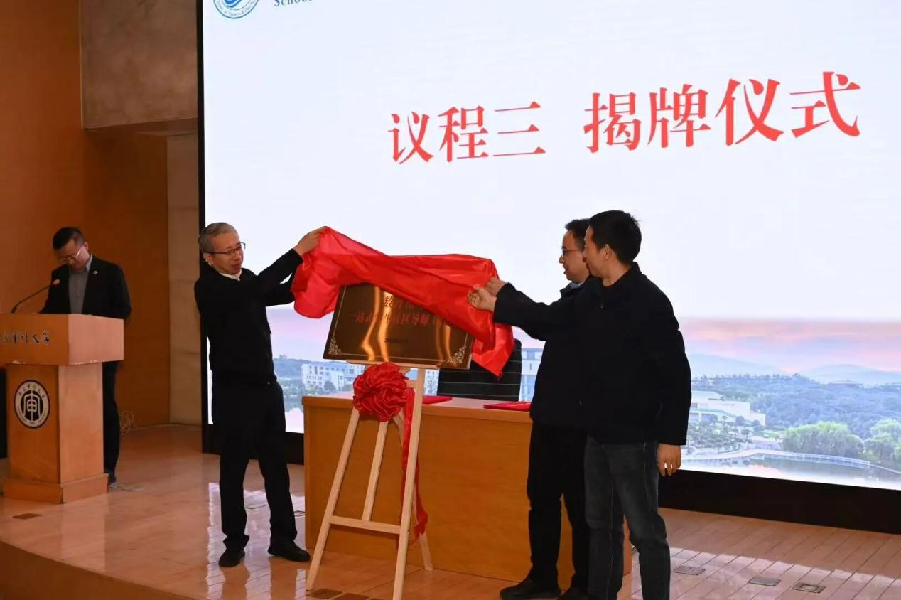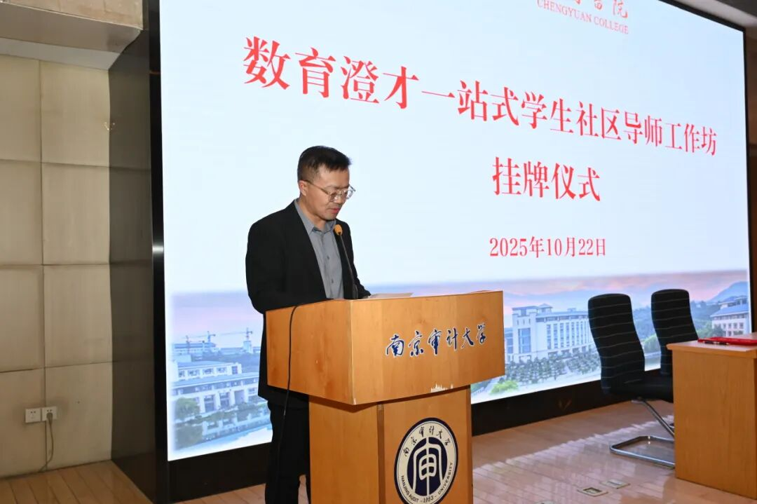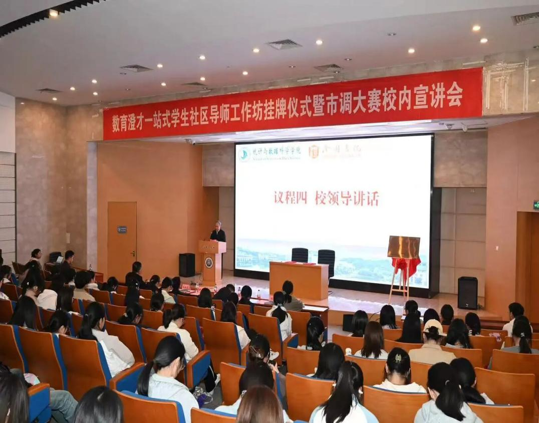随后,姜海副校长与学院党委书记徐玉华、书院党委书记杨放敏共同为“数育澄才”一站式学生社区导师工作坊揭牌。红绸揭下的瞬间,现场响起热烈的掌声,象征着社区育人工作新平台正式启用。