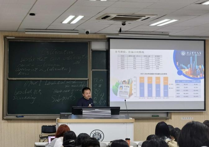 蔡老师首先将近年考研人数和各类院校录取情况、近5年国家线趋势等数据以表格和折线图的形式清晰地展现在同学们的眼前。蔡老师提供的详实数据分析使同学们对近年来我国的考研形势有了具体而深刻的认识。