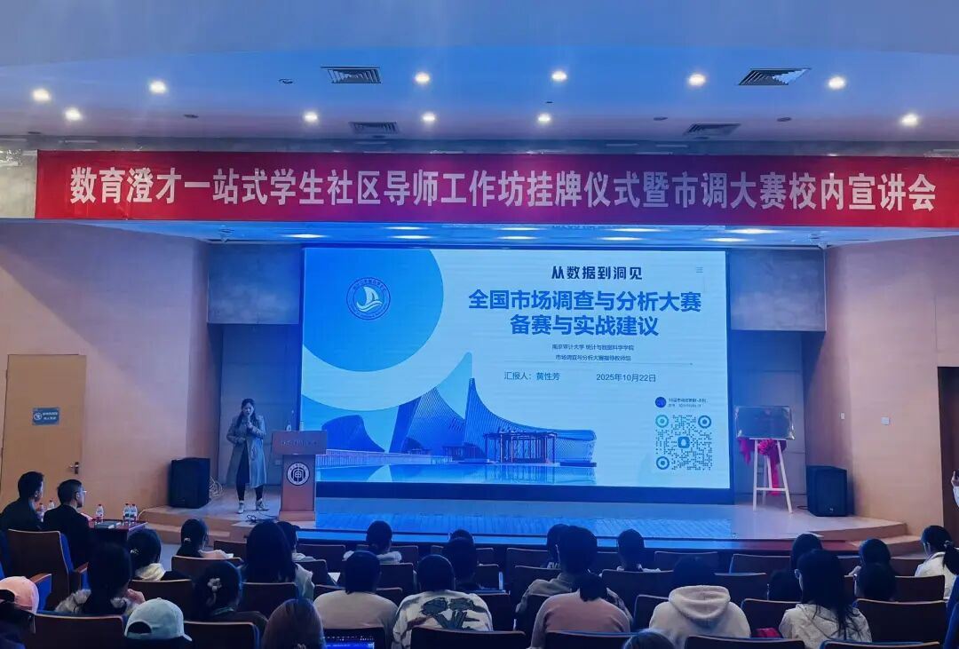 10月22日下午,统计与数据科学学院数据科学系系主任黄性芳老师受邀参加“数育澄才”一站式学生社区导师工作坊活动,为全校170余名学生解读第十六届全国大学生市场调查与分析大赛赛事相关内容。