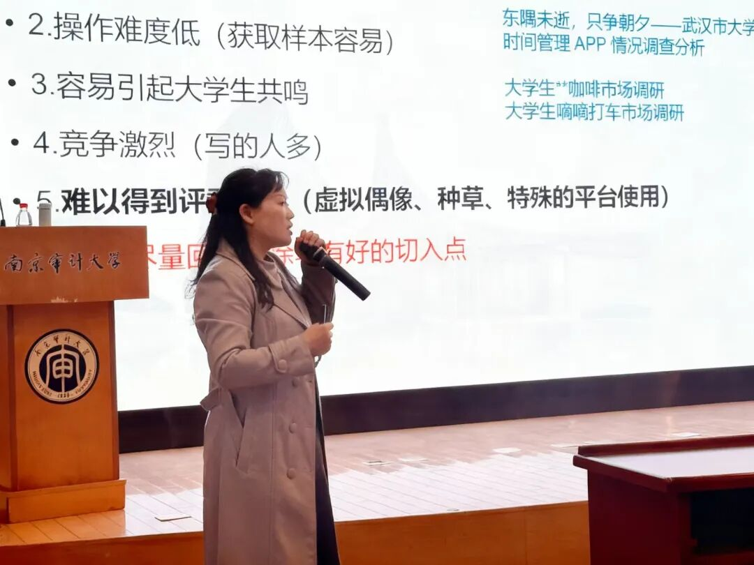 随后,黄老师结合竞赛通知,详细讲解了参赛要求,包括团队组建、作品类型(调查报告、分析报告等)及时间节点等。与此同时,重点讲解了备赛关键:从选题的“实用性+创新性”,到调研方法的“科学性+可操作性”,再到报告撰写的“逻辑严谨+数据支撑”,均给出具体建议。