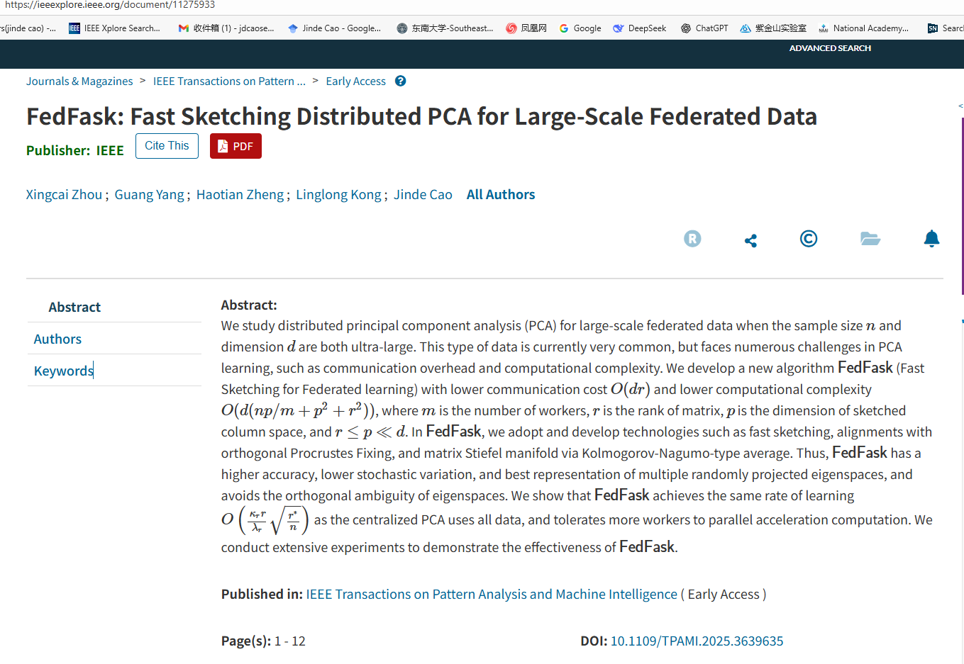 近日,南京审计大学统计与数据科学学院周兴才教授团队(博士生杨光和硕士生郑昊天)与加拿大阿尔伯塔大学孔令龙教授和东南大学曹进徳院士合作完成的学术论文“FedFask: Fast Sketching Distributed PCA for Large-Scale Federated Data”在线发表于人工智能顶级期刊IEEE Transactions on Pattern Analysis and Machine Intelligence (TPAMI)。该期刊科学引文索引影响因子为18.6,中科院分区一区顶级。 Deepseek称之为“计算机视觉与人工智能领域的圣经”、“TPAMI是模式识别、计算机视觉、机器智能和相关领域内公认的排名第一的国际期刊”和“TPAMI是模式识别、计算机视觉和机器学习领域的“皇冠上的明珠”。