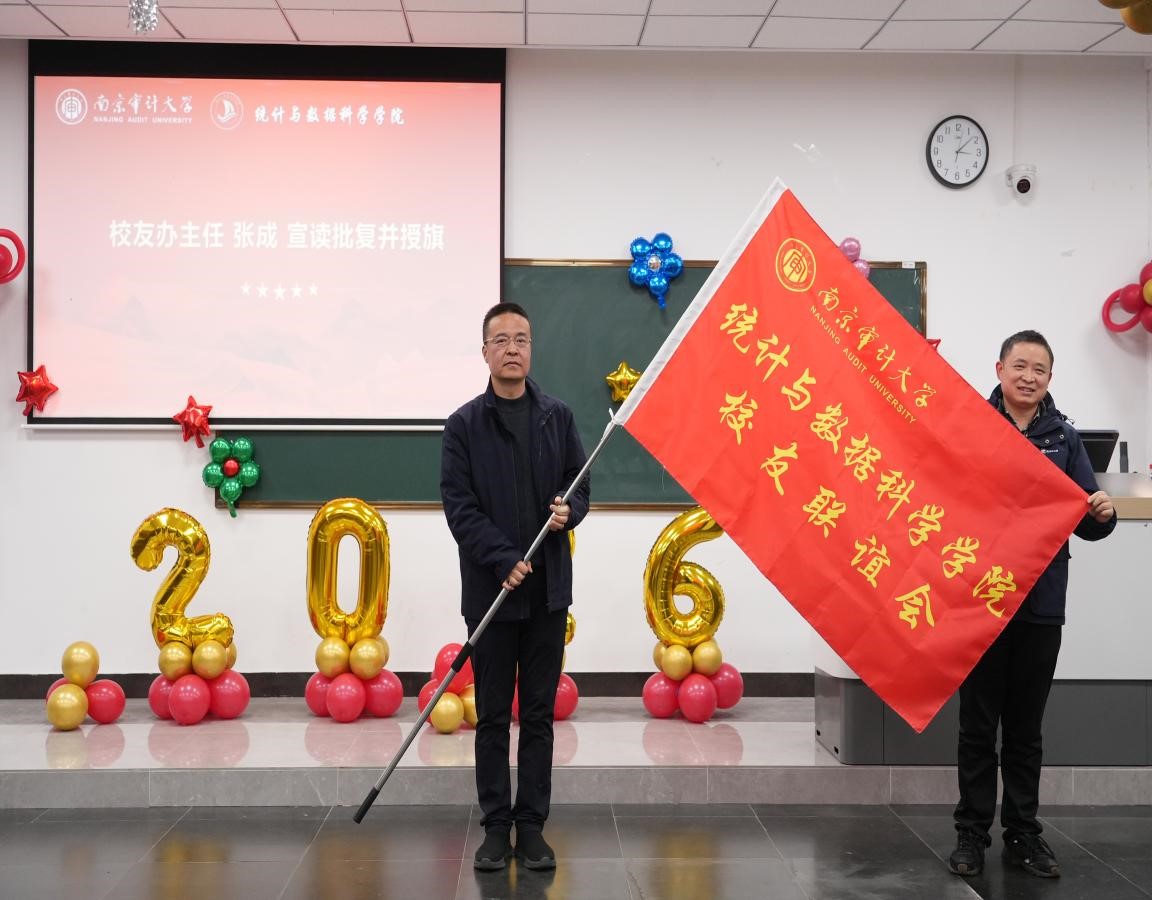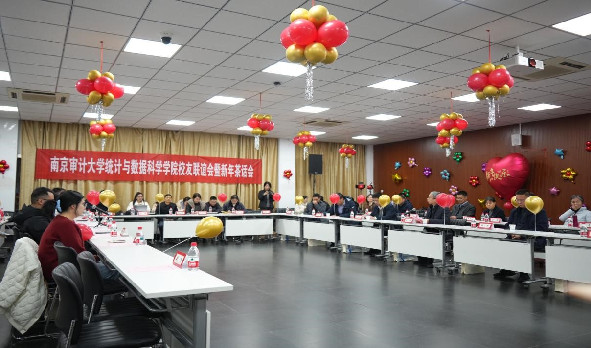 2025年12月27日,南京审计大学统计与数据科学学院校友联谊会成立大会暨新年茶话会在致明楼一楼报告厅举行,校党委常委、副校长李乾文,校党委常委、副校长姜海,常州工学院党委常委、副校长苍玉权,校友工作办公室主任张成,学院领导班子、退休教师代表、教师代表、学生代表以及来自全国各地的校友代表齐聚一堂,共同见证这一重要时刻。本次活动由学院党委副书记陆敏主持。