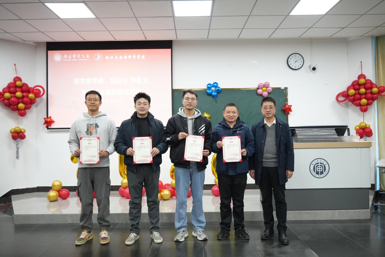 随后,李乾文副校长向学院第一届校友联谊会理事会成员颁发聘书,聘任2010级统计学校友朱承伟为会长,2013级经济统计学校友肖洋屹、2014级统计学校友徐鹏飞、2017级统计学校友蔡进红为副会长,学院党政办公室主任刘镇为秘书长。现场响起热烈掌声,标志着这一凝聚校友力量的组织正式成立。