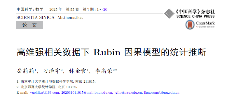近日,南京审计大学统计与数据科学学院岳莉莉、林金官教授与北京师范大学统计学院刁泽宇、李高荣教授的合作论文“高维强相关数据下Rubin 因果模型的统计推断”在统计学、数学权威期刊《中国科学:数学》在线发表。该期刊为南京审计大学认定的T2类期刊。