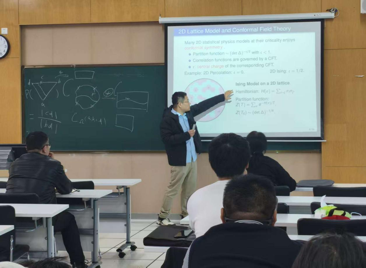 在本次讲座中,孙鑫教授以经典的二维渗流模型为核心范例,系统展示刘维尔量子引力在二维统计物理模型可观测量精确求解中的核心价值。教授首先梳理了二维临界统计物理领域的经典研究脉络,并在此基础上,系统讲解刘维尔量子引力的核心理论体系,涵盖黎曼流形上的高斯自由场(GFF)基础构造、γ-LQG 随机几何的数学框架等,完整呈现刘维尔量子引力是由二维随机几何问题提供的、区别于传统共形场论的严格研究路径。本次分享的核心创新,在于突破传统量子引力方法的壁垒,融合了刘维尔共形场论的精确可解性,及其与 SLE 曲线的耦合机制,为二维统计物理经典难题的严格求解提供了全新路径。最后,孙教授还简要介绍了刘维尔量子引力方法在平面布朗运动相关概率问题中的拓展应用,展现了该理论在概率统计与数学物理交叉领域的广阔应用前景。