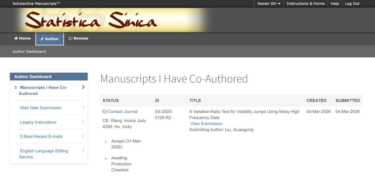 近日,我校统计与数据科学学院博士生施科文完成的学术论文“A Variation-Ratio Test for Volatility Jumps Using Noisy High Frequency Data”以南京审计大学为第一署名单位被统计学权威期刊Statistica Sinica接收。论文指导教师为我校统计与数据科学学院刘广应教授,上海财经大学张志远副教授。