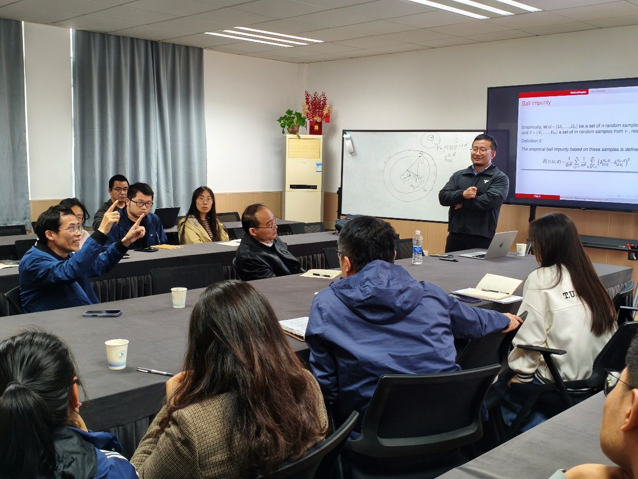 在场师生就此展开了热烈且深入的研讨,尤其围绕球不纯度距离算法的理论细节、适用边界,度量空间的参数选择规则,以及非欧数据距离计算的特点等核心问题,进行了激烈的学术交流与思想碰撞。李挺研究员结合自身研究经验与团队后续研究规划,对每一个问题都进行了细致严谨的解答,与提问师生展开了多轮深入的探讨,现场学术交流氛围十分浓厚。